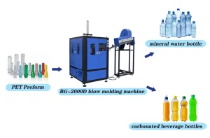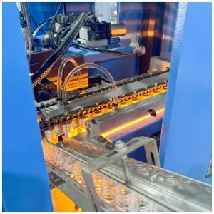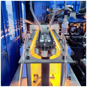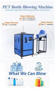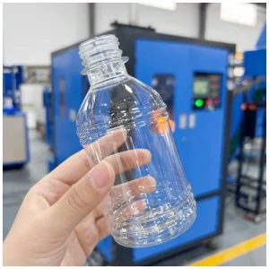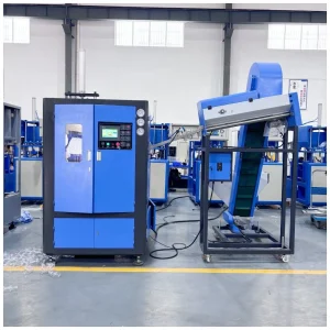 This fully automatic 2-cavity polyester bottle blowing machine is suitable for producing polyester bottles of various shapes.
