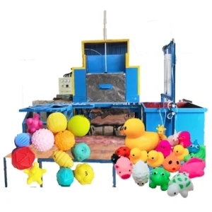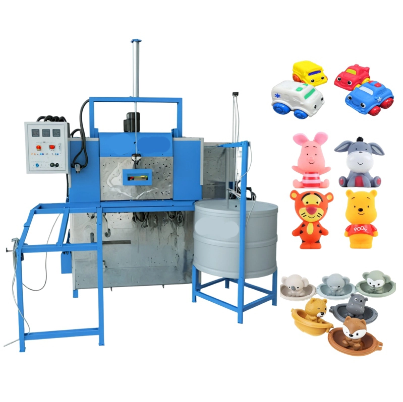 Rotational molding machines are used to produce PVC/vinyl/plaster-solid toys, such as squeeze animals, jumping animals, fish bait, Barbie dolls, PVC balls, and anything made of PVC with a hollow interior. It can produce both soft and hard materials and can be customized. The loading plate is heated and rotated to homogenize the material, forming the final product.