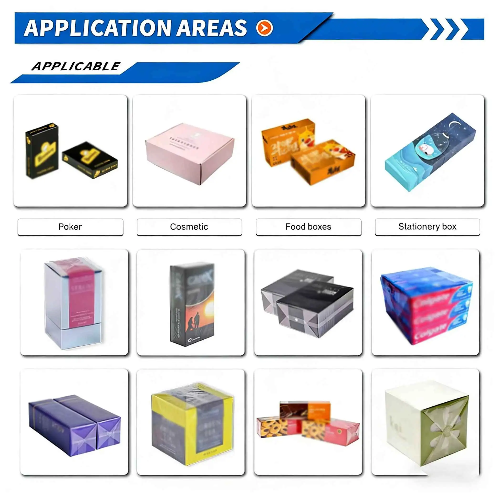 2. Versatility and Flexibility in Material Application. Handles a variety of substrate materials, including cardboard, hardboard, corrugated cardboard, and plastic sheets. Compatible with various films: BOPP, PET, PVC, holographic film, and specialty textured films. A quick-change mold/former system allows for rapid switching between different product sizes and shapes, minimizing downtime.