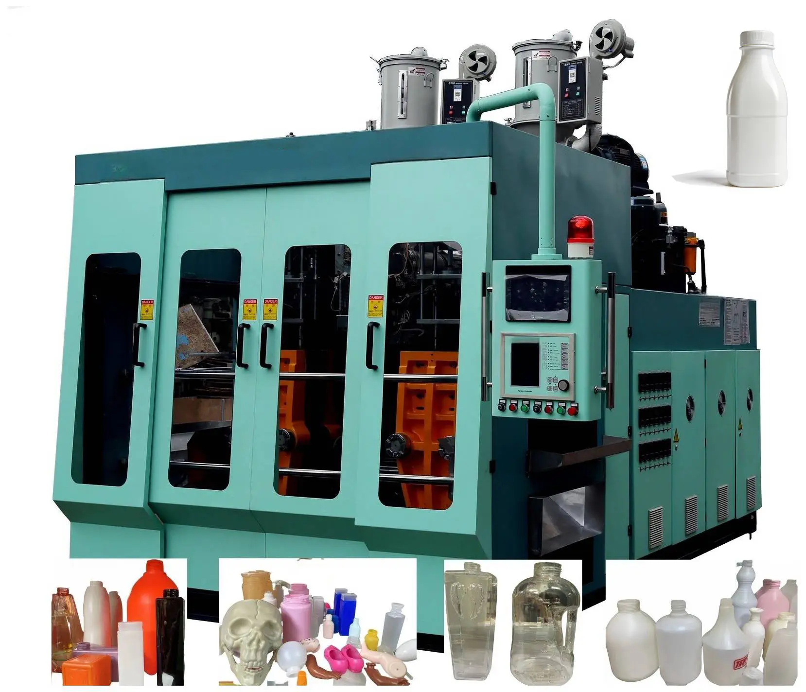 This model is the smallest blow molding machine, characterized by its small size, high speed, stability, and energy efficiency. It can be equipped with automatic bottle neck degreasing devices, rotary bottle neck cutting devices, conveyor belts, and automatic crusher systems. Single-die, double-die, triple-die, quadruple-die, and six-die head options are available, with a daily output (24 hours) of approximately 20,000-120,000 units; it can produce plastic hollow products from 0.01 to 1.8L.